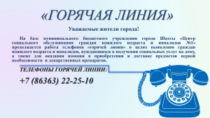 Приветствуем Вас на официальном сайте муниципального бюджетного учреждения города Шахты «Центр социального обслуживания граждан пожилого возраста и инвалидов № 1». Наш Центр (МБУ г. Шахты «ЦСО № 1») работает в сфере социального обслуживания населения города Шахты с 1990 года, являясь значимым и востребованным в городе благодаря высокому профессионализму сотрудников — энергичных, образованных, талантливых, большинство из которых трудятся много лет с ощущением, что работа – это неотъемлемая часть их жизни, жизни с любовью к людям и заботой о них! За эти годы структура учреждения достаточно трансформировалась, но всегда неизменным оставалось и остаётся главное – качество и своевременность предоставления помощи нуждающимся в ней людям! Продление активного долголетия наших получателей социальных услуг и обеспечение их достойной жизни в преклонном возрасте является приоритетным направлением работы нашего Центра. Бесспорно, оперативное решение самых сложных задач, реализация любых смелых идей, технологий и социальных проектов — всё это ради наших получателей услуг, чей каждый новый день жизни – это маленькая ПОБЕДА НАД большим ВОЗРАСТОМ Создавая сайт, мы руководствовались стремлением повысить уровень информационной открытости и доступности сведений о работе нашего учреждения. На сайте вы найдете историю создания, информацию о структуре и деятельности Центра, контактах и режиме работы, сможете познакомиться с нашими новостями. Если у Вас есть желание жить долго и активно, посещать спортивные, творческие и образовательные занятия, значит, Вам обязательно нужно прийти в наш Центр! Мы открыты к общению и всегда ждём Вас! С уважением, Наталья Валерьевна Лотарева