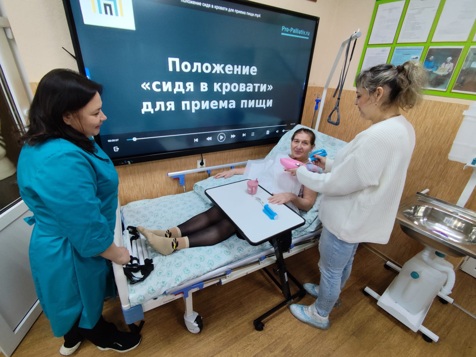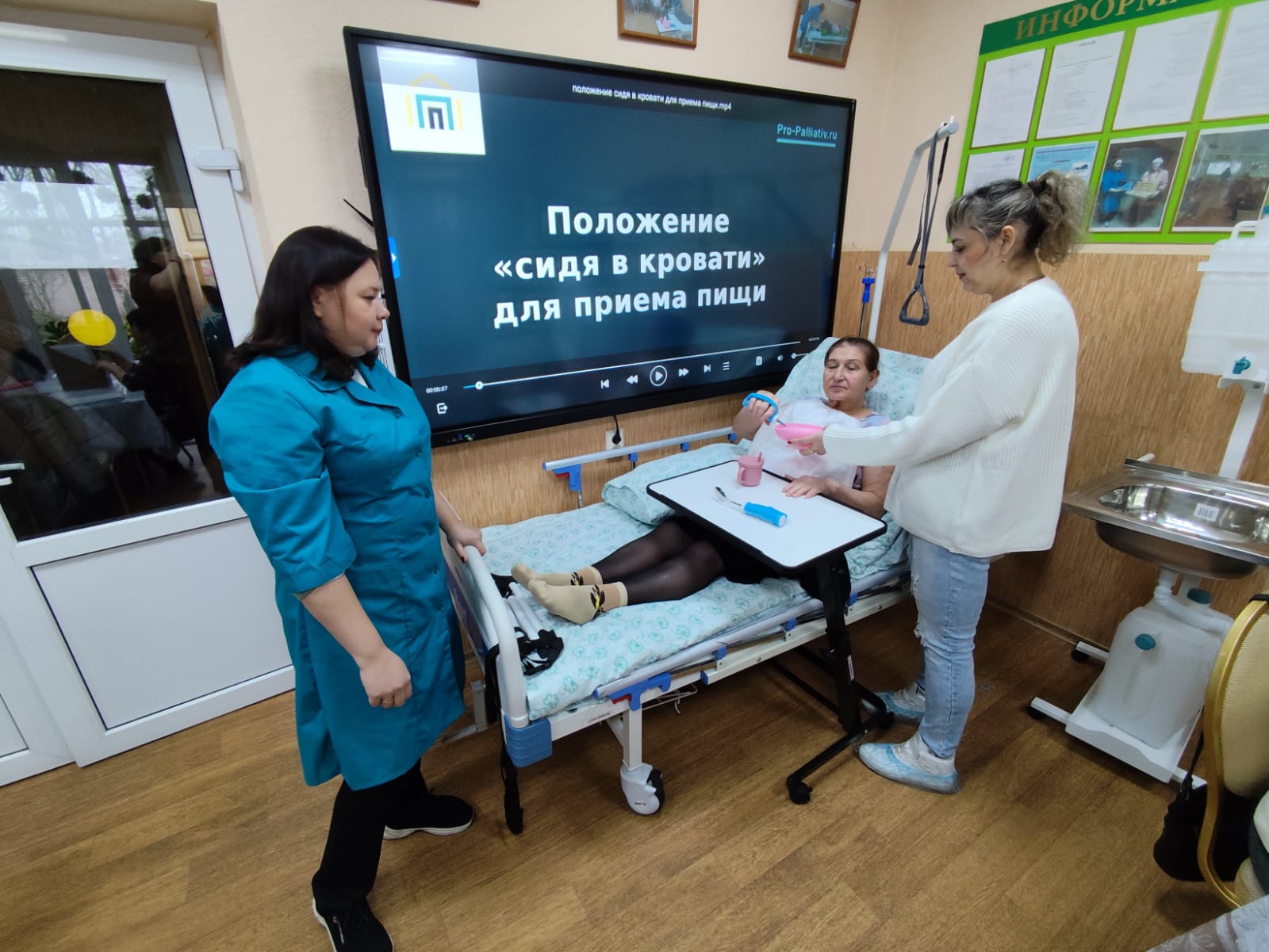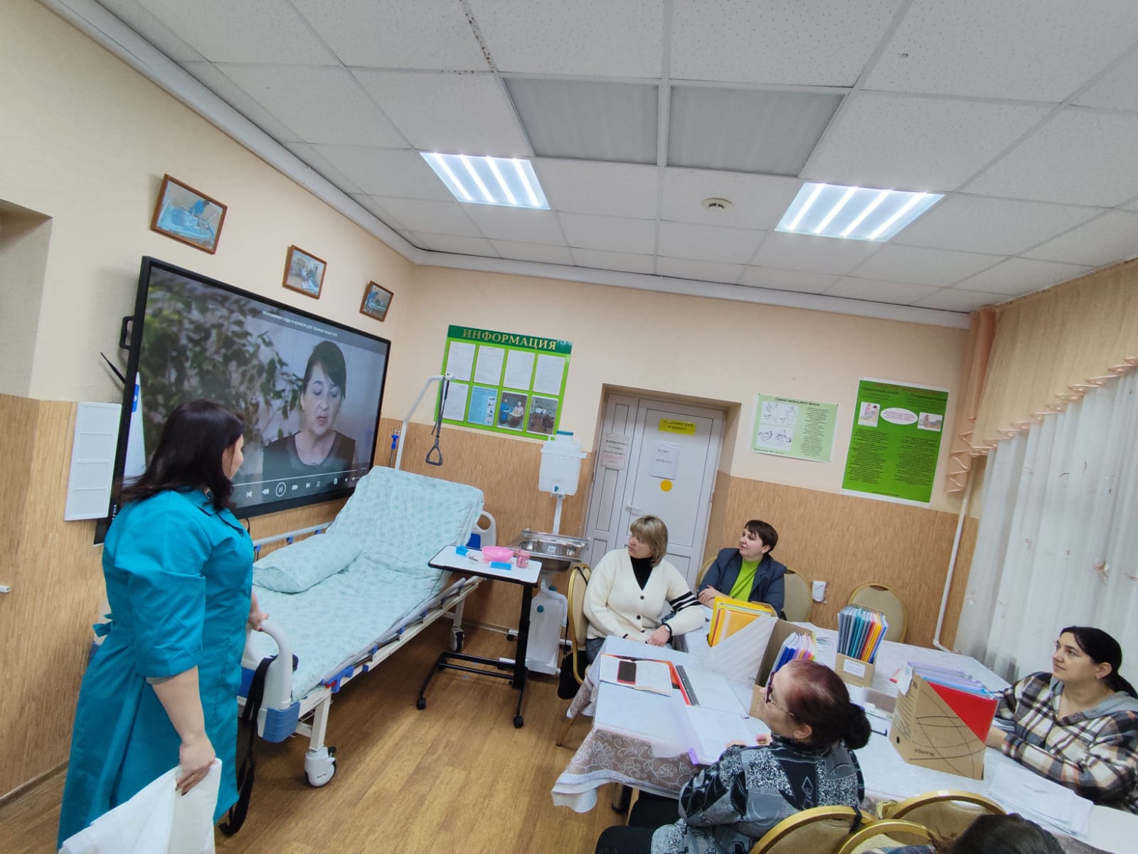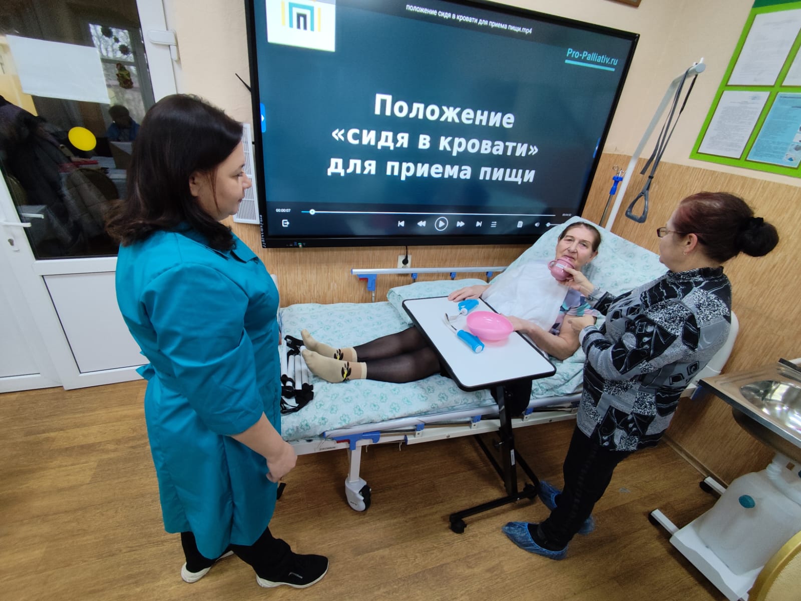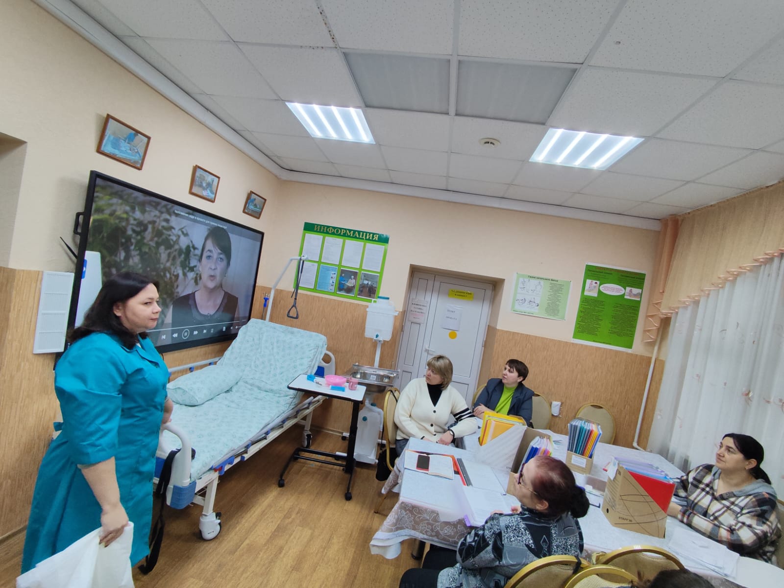 Проведение занятия в Школе по уходуНа базе МБУ г. Шахты «ЦСО №1» создана Школа по уходу. Ведущая роль Школы по уходу – обучение граждан, желающих самостоятельно ухаживать за своими близкими, специалистов и родственников получателей социальных услуг с использованием технических средств реабилитации практическим навыкам ухода за тяжелобольными людьми. 28.04.2025 г. специалист по социальной работе Соломатина Н.В. провела тематическое занятие с социальными работниками ОСО №4 на тему «Положение сидя в кровати для приёма пищи». |