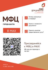 УРА! В Ростовской области работает «Цифровой МФЦ» в мессенджере MAX!А это значит, что у жителей города Шахты появилась возможность решать вопросы с МФЦ ОНЛАЙН, НЕ ВЫХОДЯ ИЗ ДОМА! Чат-бот поможет найти адреса и время работы центров, узнать статус обращения, Всё доступно круглосуточно! https://max.ru/mfcshakhty_max_bot а так же по QR-коду